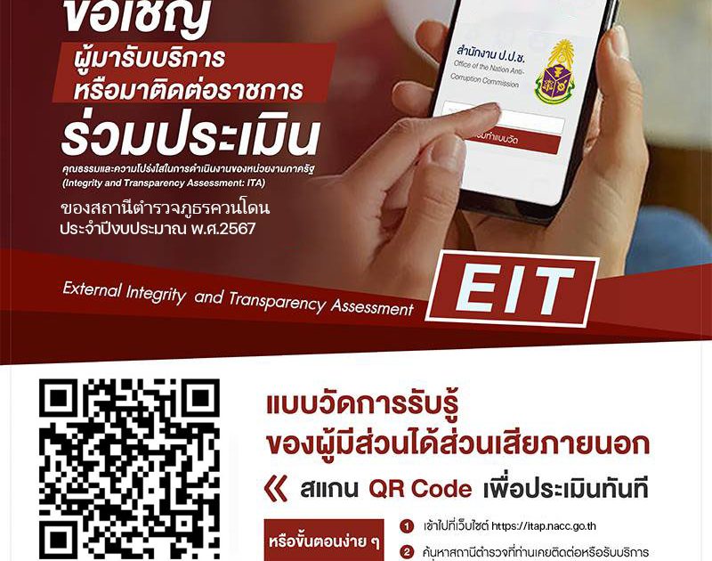 ขอเชิญประชาชนผู้มารับบริการหรือมาติดต่อราชการร่วมประเมิน คุณธรรมและความโปร่งใสในการดำเนินงานของหน่วยงานภาครัฐ
