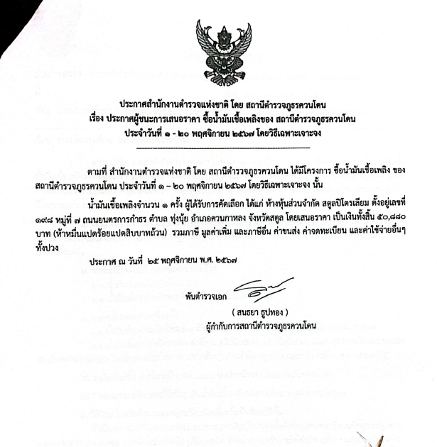 ตามที่ สำนักงานตำรวจแห่งชาติ โดย สถานีตำรวจภูธรควนโดน ได้มีโครงการ ซื้อน้ำมันเชื้อเพลิงของสถานีตำรวจ