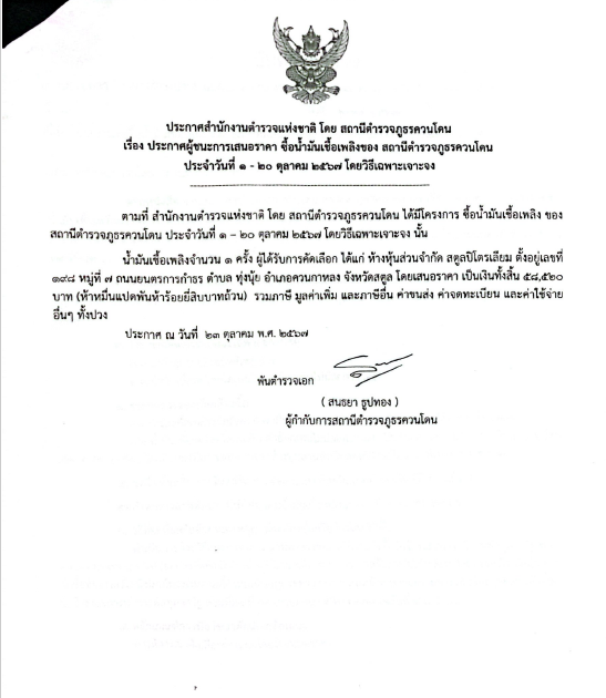 เรื่อง ประกาศผู้ชนะการเสนอราคา ซื้อน้ำมันเชื้อเพลิงของ สถานีตำรวจภูธรควนโดน