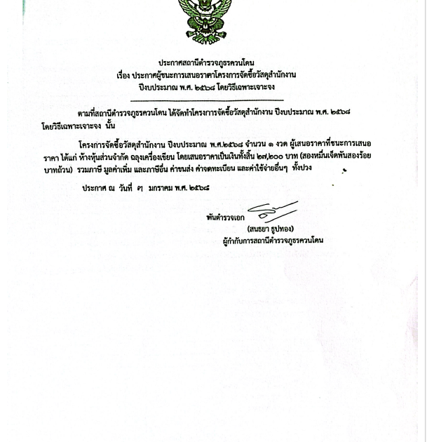 ประกาศผู้ชนะการเสนอราคาโครงการจัดซื้อวัสดุสำนักงาน งวดที่ 1 เดือนมกราคม พ.ศ.2568 ประจำปีงบประมาณ พ.ศ.2568