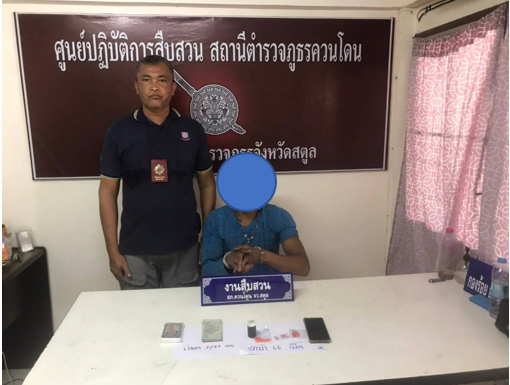 เจ้าหน้าที่ตำรวจชุดสืบสวนปรามปรามยาเสพติด สภ.ควนโดน นำโดย พ.ต.ท.ณรงค์ กลับใจได้ สว.สส.สภ.ควนโดน พร้อมด้วยชุดสืบสวน ได้จับกุมผู้ต้องหา จำนวน 1 คน โดยกล่าวหาว่า “จำหน่ายยาเสพติดให้โทษประเภท 1 (เมทแอมเฟตามีนหรือยาบ้า )โดยมีไว้ในครอบครองเพื่อจำหน่ายโดยไม่ได้รับอนุญาต,โดยกระทำเพื่อการค้า และเสพยาเสพติดให้โทษประเภท 1 (เมทแอมเฟตามีน) โดยไม่ได้รับอนุญาต”